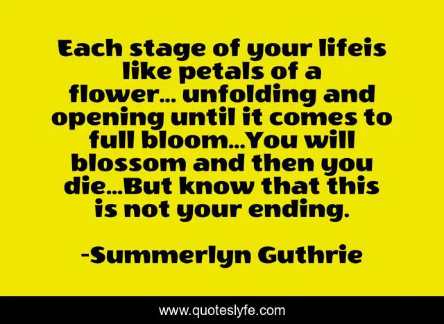 This page presents the quote "Each stage of your lifeis like petals of a flower... unfolding and opening until it comes to full bloom...You will blossom and then you die...But know that this is not your ending.". Author of this quote is Summerlyn Guthrie. This quote is about spiritual-growth, philosophy-religion, life-lesson, philosophy, philosophy-of-mind, spirituality, life-and-death, life-philosophy, spiritual-insights,.