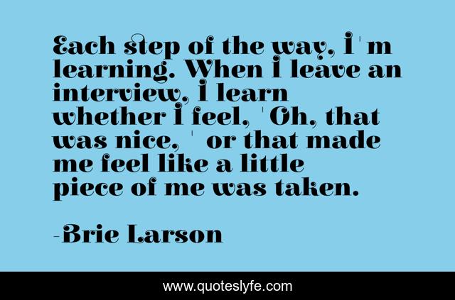 This page presents the quote "Each step of the way, I'm learning. When I leave an interview, I learn whether I feel, 'Oh, that was nice, ' or that made me feel like a little piece of me was taken.". Author of this quote is Brie Larson. This quote is about me, step, nice,.