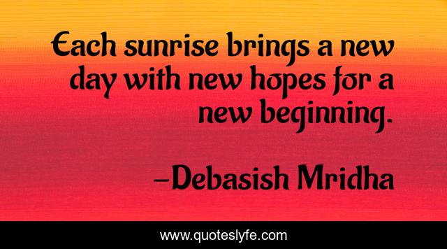 This page presents the quote "Each sunrise brings a new day with new hopes for a new beginning.". Author of this quote is Debasish Mridha. This quote is about debasish, new-beginning, hopeful, philosophy, debasish-mridha, new-day, new-hopes, inspirational, mridha,.