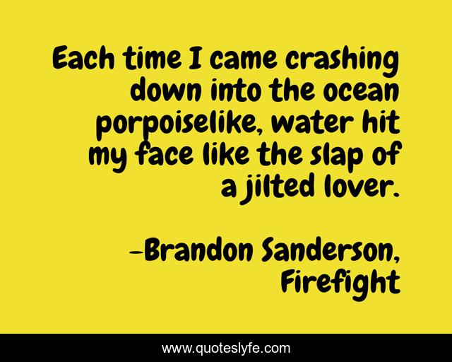 This page presents the quote "Each time I came crashing down into the ocean porpoiselike, water hit my face like the slap of a jilted lover.". Author of this quote is Brandon Sanderson, Firefight. This quote is about hit, slap, ocean, water, lover, porpoiselike, jilted, face,.