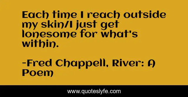 This page presents the quote "Each time I reach outside my skin/I just get lonesome for what's within.". Author of this quote is Fred Chappell, River: A Poem. This quote is about loneliness, self,.