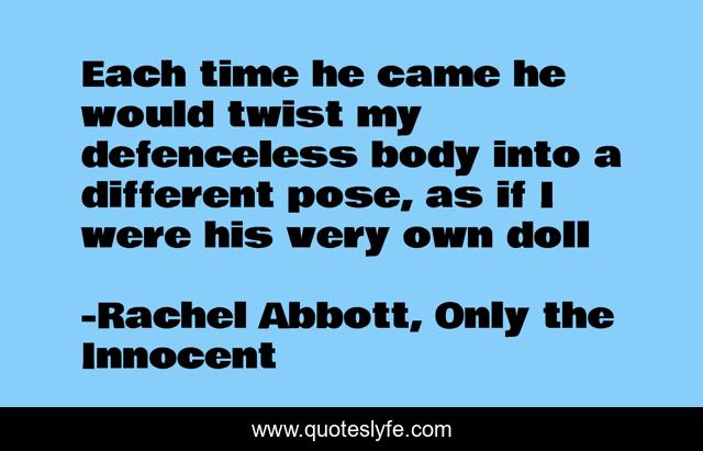 This page presents the quote "Each time he came he would twist my defenceless body into a different pose, as if I were his very own doll". Author of this quote is Rachel Abbott, Only the Innocent. This quote is about abusive-relationships, abuse,.