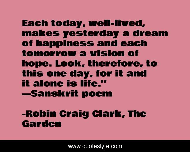 This page presents the quote "Each today, well-lived, makes yesterday a dream of happiness and each tomorrow a vision of hope. Look, therefore, to this one day, for it and it alone is life.” —Sanskrit poem". Author of this quote is Robin Craig Clark, The Garden. This quote is about poem, life, love, hope, awakening, affection, inspirational, sanskrit, enthusiasm,.
