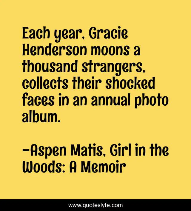 This page presents the quote "Each year, Gracie Henderson moons a thousand strangers, collects their shocked faces in an annual photo album.". Author of this quote is Aspen Matis, Girl in the Woods: A Memoir. This quote is about aspen-matis-memoir, memoir,.