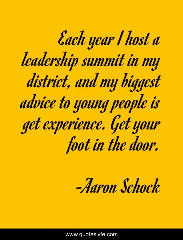 This page presents the quote "Each year I host a leadership summit in my district, and my biggest advice to young people is get experience. Get your foot in the door.". Author of this quote is Aaron Schock. This quote is about advice, door, experience,.