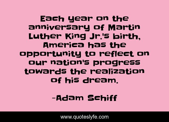 This page presents the quote "Each year on the anniversary of Martin Luther King Jr.'s birth, America has the opportunity to reflect on our nation's progress towards the realization of his dream.". Author of this quote is Adam Schiff. This quote is about progress, opportunity,.