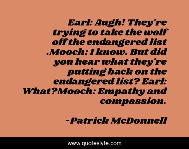 This page presents the quote "Earl: Augh! They're trying to take the wolf off the endangered list .Mooch: I know. But did you hear what they're putting back on the endangered list? Earl: What?Mooch: Empathy and compassion.". Author of this quote is Patrick McDonnell. This quote is about compassion, empathy, animal-rights, hope, endangered-animals,.