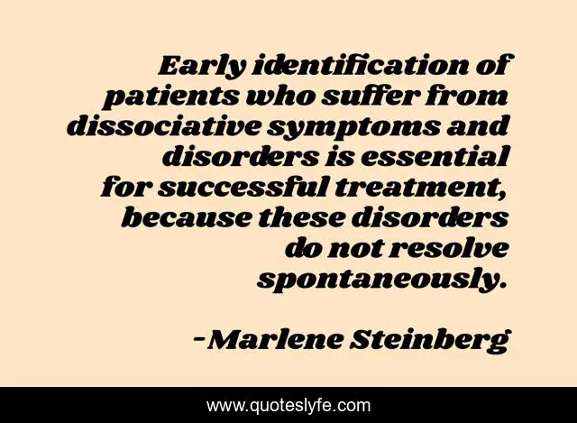 This page presents the quote "Early identification of patients who suffer from dissociative symptoms and disorders is essential for successful treatment, because these disorders do not resolve spontaneously.". Author of this quote is Marlene Steinberg. This quote is about dissociative-disorders, mental-health, diagnosis, dissociative-identity-disorder,.