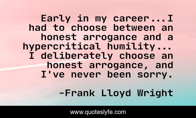 This page presents the quote "Early in my career...I had to choose between an honest arrogance and a hypercritical humility... I deliberately choose an honest arrogance, and I've never been sorry.". Author of this quote is Frank Lloyd Wright. This quote is about arrogance, honesty, humility,.