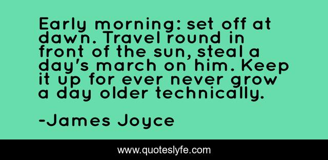 This page presents the quote "Early morning: set off at dawn. Travel round in front of the sun, steal a day's march on him. Keep it up for ever never grow a day older technically.". Author of this quote is James Joyce. This quote is about sun, travel, day, inspirationalmorning,.