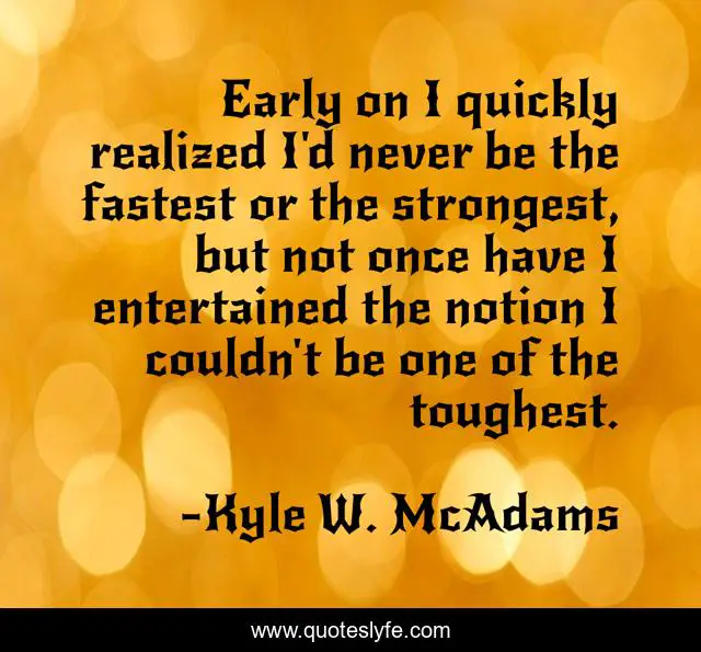 This page presents the quote "Early on I quickly realized I'd never be the fastest or the strongest, but not once have I entertained the notion I couldn't be one of the toughest.". Author of this quote is Kyle W. McAdams. This quote is about inspirational-attitude, behaviour, attitude, sports,.