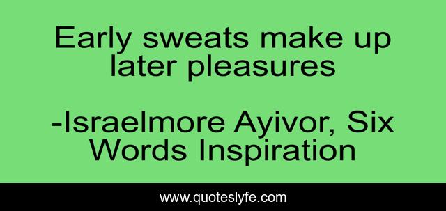 This page presents the quote "Early sweats make up later pleasures". Author of this quote is Israelmore Ayivor, Six Words Inspiration. This quote is about make-up, six-words-inspiration, make-ups, pleasure, sweats, hard-work, work-hard, joy, six,.