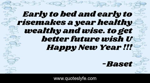 This page presents the quote "Early to bed and early to risemakes a year healthy wealthy and wise. to get better future wish U Happy New Year !!!". Author of this quote is Baset. This quote is about new-year, quotes, future, wishes, morning,.