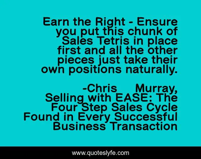 This page presents the quote "Earn the Right - Ensure you put this chunk of Sales Tetris in place first and all the other pieces just take their own positions naturally.". Author of this quote is Chris Murray, Selling with EASE: The Four Step Sales Cycle Found in Every Successful Business Transaction. This quote is about business-success, negotiation, sales-effectiveness, selling, business-advice, sales-training, business, influence, sales,.