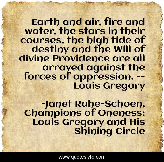 This page presents the quote "Earth and air, fire and water, the stars in their courses, the high tide of destiny and the Will of divine Providence are all arrayed against the forces of oppression. -- Louis Gregory". Author of this quote is Janet Ruhe-Schoen, Champions of Oneness: Louis Gregory and His Shining Circle. .