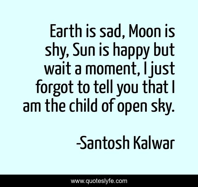 This page presents the quote "Earth is sad, Moon is shy, Sun is happy but wait a moment, I just forgot to tell you that I am the child of open sky.". Author of this quote is Santosh Kalwar. This quote is about humor, nature, inspirational, enthusiasm, love, affection,.