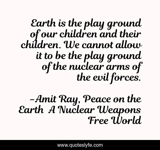 This page presents the quote "Earth is the play ground of our children and their children. We cannot allow it to be the play ground of the nuclear arms of the evil forces.". Author of this quote is Amit Ray, Peace on the Earth A Nuclear Weapons Free World. This quote is about peaceful, peace-on-earth, disarmament, peace, nuclear-war, inspirational, peace-of-mind, children, world-peace,.
