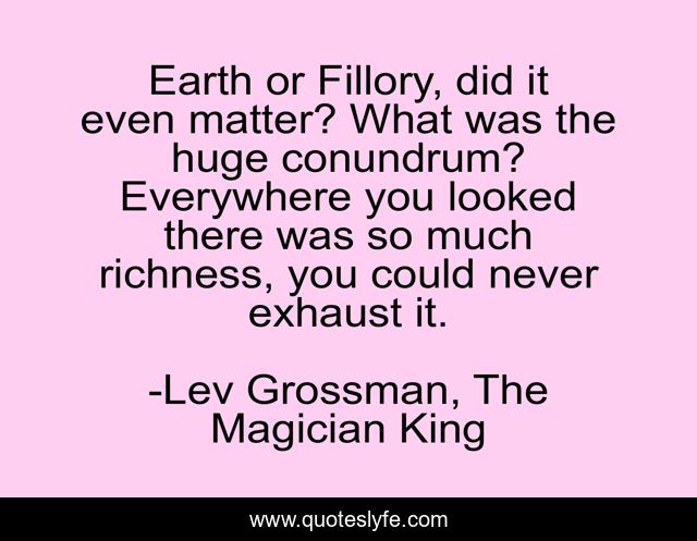 This page presents the quote "Earth or Fillory, did it even matter? What was the huge conundrum? Everywhere you looked there was so much richness, you could never exhaust it.". Author of this quote is Lev Grossman, The Magician King. This quote is about earth, life, magic, inspirational, enthusiasm,.