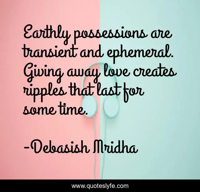 This page presents the quote "Earthly possessions are transient and ephemeral. Giving away love creates ripples that last for some time.". Author of this quote is Debasish Mridha. This quote is about philosophy, give-love-away, transient-and-ephemeral, debasish-mridha, quotes, debasish-mridha-md, inspirational, enthusiasm, earthly-possessions,.