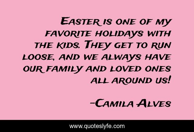 This page presents the quote "Easter is one of my favorite holidays with the kids. They get to run loose, and we always have our family and loved ones all around us!". Author of this quote is Camila Alves. This quote is about loved, family, holidays,.