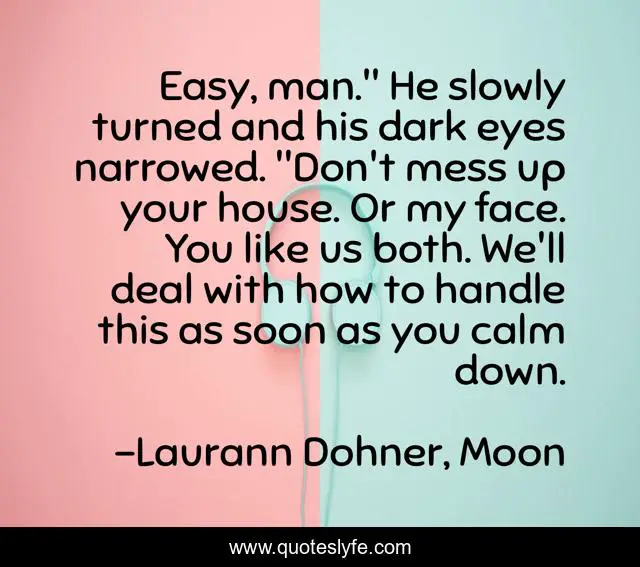 This page presents the quote "Easy, man." He slowly turned and his dark eyes narrowed. "Don't mess up your house. Or my face. You like us both. We'll deal with how to handle this as soon as you calm down.". Author of this quote is Laurann Dohner, Moon. This quote is about harley, upset, moon,.