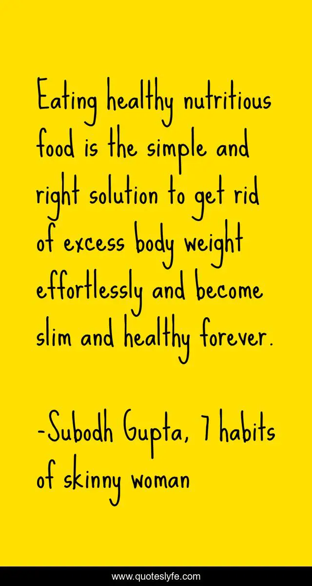 This page presents the quote "Eating healthy nutritious food is the simple and right solution to get rid of excess body weight effortlessly and become slim and healthy forever.". Author of this quote is Subodh Gupta, 7 habits of skinny woman. This quote is about nutrition, food, fitness, weight-loss, health, self-help, obesity,.