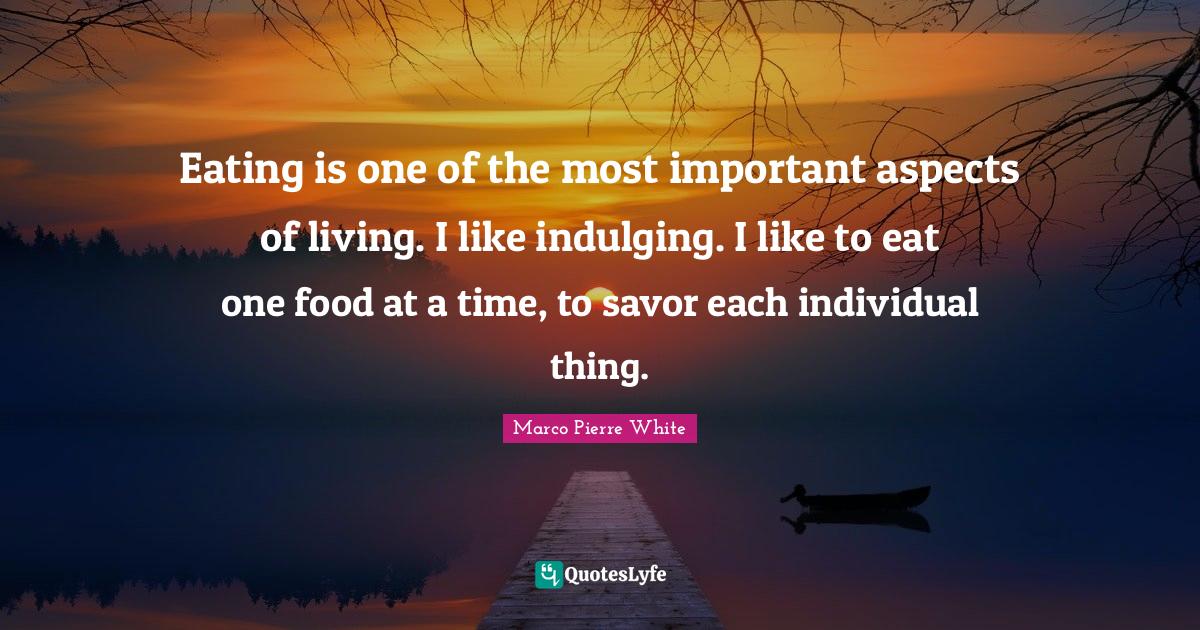 This page presents the quote "Eating is one of the most important aspects of living. I like indulging. I like to eat one food at a time, to savor each individual thing.". Author of this quote is Marco Pierre White. This quote is about important, time, food, individual, eating,.