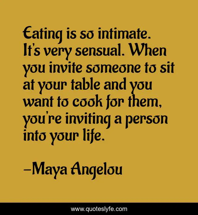 This page presents the quote "Eating is so intimate. It's very sensual. When you invite someone to sit at your table and you want to cook for them, you're inviting a person into your life.". Author of this quote is Maya Angelou. This quote is about life, eating,.
