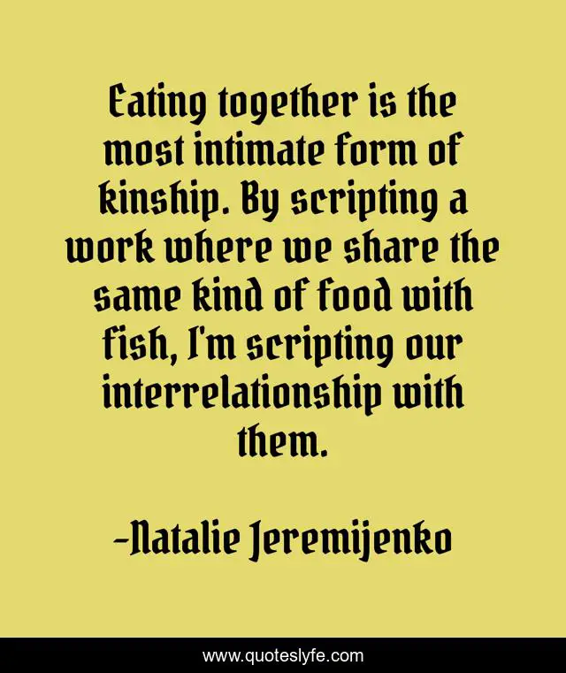 This page presents the quote "Eating together is the most intimate form of kinship. By scripting a work where we share the same kind of food with fish, I'm scripting our interrelationship with them.". Author of this quote is Natalie Jeremijenko. This quote is about fish, work, together,.
