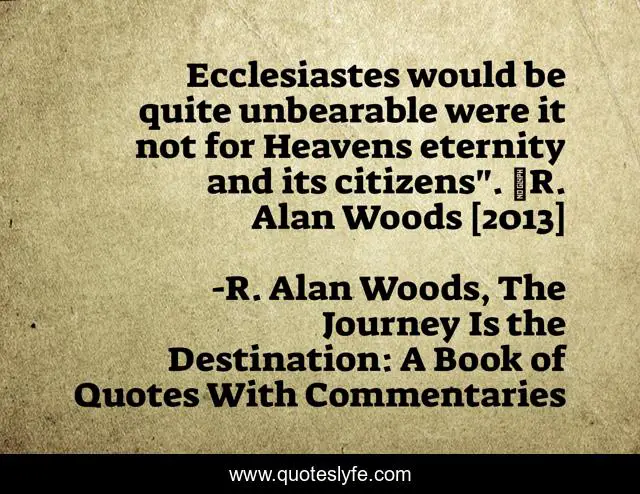 This page presents the quote "Ecclesiastes would be quite unbearable were it not for Heavens eternity and its citizens". ~R. Alan Woods [2013]". Author of this quote is R. Alan Woods, The Journey Is the Destination: A Book of Quotes With Commentaries. This quote is about heaven, heavenly-rewards, vane, ecclesiastes, r-alan-woods, vanity,.