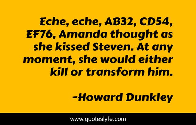 This page presents the quote "Eche, eche, AB32, CD54, EF76, Amanda thought as she kissed Steven. At any moment, she would either kill or transform him.". Author of this quote is Howard Dunkley. This quote is about horror, zombies, ef76-strain,.