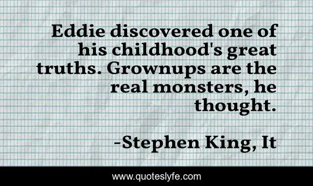 This page presents the quote "Eddie discovered one of his childhood's great truths. Grownups are the real monsters, he thought.". Author of this quote is Stephen King, It. This quote is about grownups, monster, horror, it, clown, eddie, pennywise, stephen-king, fear,.