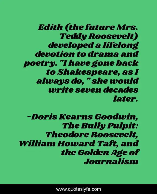 This page presents the quote "Edith (the future Mrs. Teddy Roosevelt) developed a lifelong devotion to drama and poetry. "I have gone back to Shakespeare, as I always do, " she would write seven decades later.". Author of this quote is Doris Kearns Goodwin, The Bully Pulpit: Theodore Roosevelt, William Howard Taft, and the Golden Age of Journalism. This quote is about taste, cultivation, acculturation, reflection,.