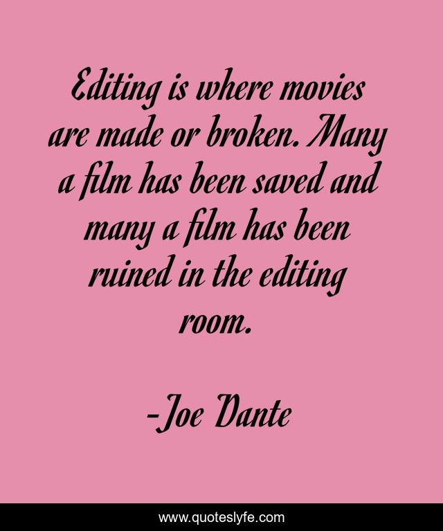 This page presents the quote "Editing is where movies are made or broken. Many a film has been saved and many a film has been ruined in the editing room.". Author of this quote is Joe Dante. This quote is about broken, editing,.