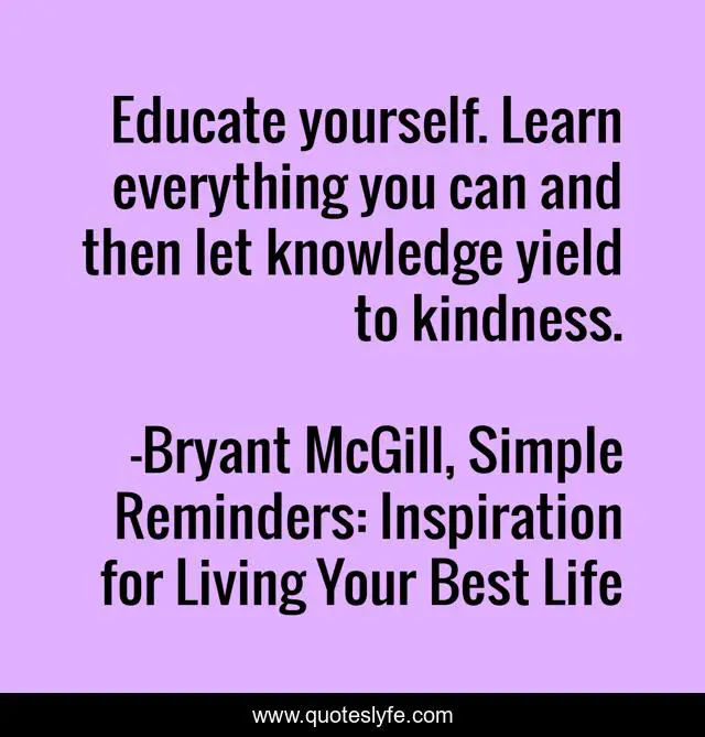 This page presents the quote "Educate yourself. Learn everything you can and then let knowledge yield to kindness.". Author of this quote is Bryant McGill, Simple Reminders: Inspiration for Living Your Best Life. This quote is about kindness, education, knowledge, learning,.