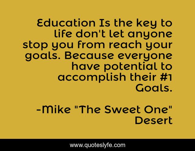 This page presents the quote "Education Is the key to life don't let anyone stop you from reach your goals. Because everyone have potential to accomplish their #1 Goals.". Author of this quote is Mike "The Sweet One" Desert. This quote is about enthusiasm, inspirational,.
