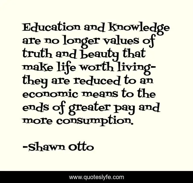 This page presents the quote "Education and knowledge are no longer values of truth and beauty that make life worth living- they are reduced to an economic means to the ends of greater pay and more consumption.". Author of this quote is Shawn Otto. This quote is about science, education, knowledge,.