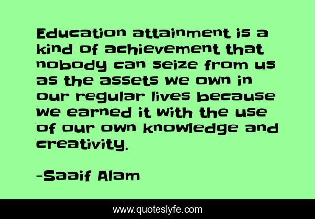 This page presents the quote "Education attainment is a kind of achievement that nobody can seize from us as the assets we own in our regular lives because we earned it with the use of our own knowledge and creativity.". Author of this quote is Saaif Alam. This quote is about self-respect, education, success,.
