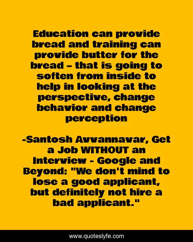 This page presents the quote "Education can provide bread and training can provide butter for the bread – that is going to soften from inside to help in looking at the perspective, change behavior and change perception". Author of this quote is Santosh Avvannavar, Get a Job WITHOUT an Interview - Google and Beyond: "We don't mind to lose a good applicant, but definitely not hire a bad applicant.". This quote is about career, job, education,.