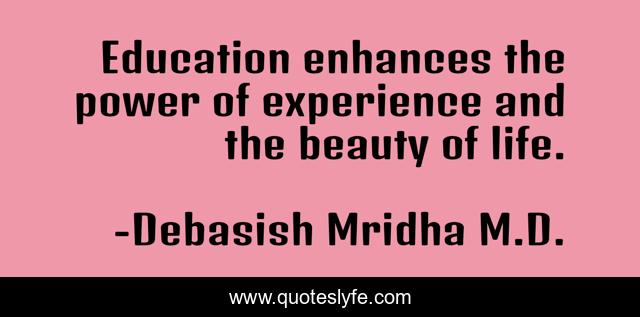 This page presents the quote "Education enhances the power of experience and the beauty of life.". Author of this quote is Debasish Mridha M.D.. This quote is about beauty-of-life, mridha, debasish, experience, quotes, inspirational, power-of-experience, enthusiasm, education,.