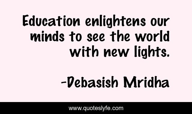 This page presents the quote "Education enlightens our minds to see the world with new lights.". Author of this quote is Debasish Mridha. This quote is about enlightens-the-mind, philosophy, debasish-mridha, quotes, see-the-world, inspirational, enthusiasm, education, debasish-mridha-m-d,.