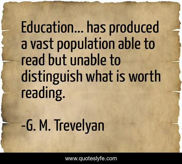 This page presents the quote "Education... has produced a vast population able to read but unable to distinguish what is worth reading.". Author of this quote is G. M. Trevelyan. This quote is about reading, worth, population,.