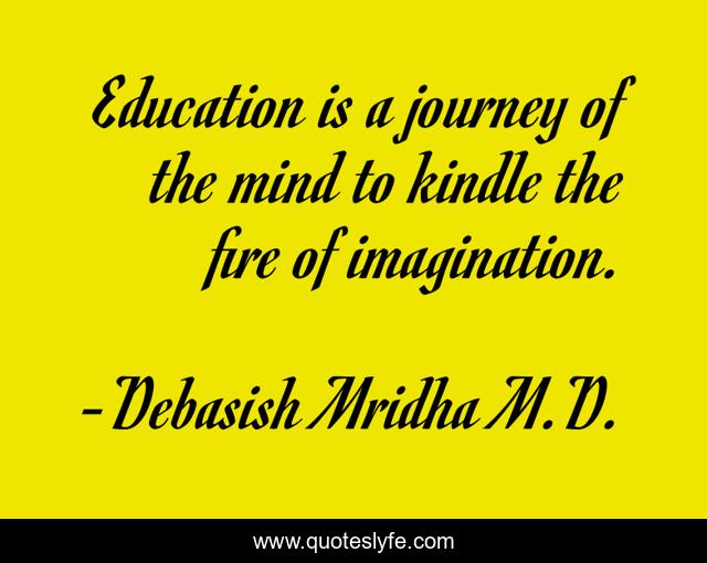 This page presents the quote "Education is a journey of the mind to kindle the fire of imagination.". Author of this quote is Debasish Mridha M.D.. This quote is about journey-of-the-mind, imagination, debasish-mridha, philosophy, mind, quotes, inspirational, enthusiasm, debasish-mridha-m-d,.