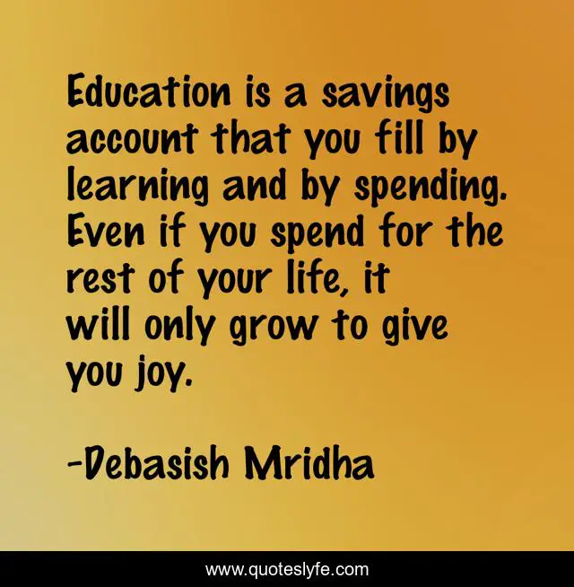 This page presents the quote "Education is a savings account that you fill by learning and by spending. Even if you spend for the rest of your life, it will only grow to give you joy.". Author of this quote is Debasish Mridha. This quote is about inspirational, quotes, philosophy, debasish-mridha, importance-of-an-education, joy-of-education, learning, enthusiasm, education,.