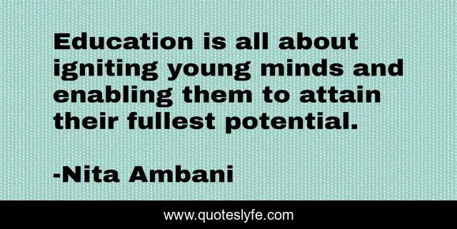 This page presents the quote "Education is all about igniting young minds and enabling them to attain their fullest potential.". Author of this quote is Nita Ambani. This quote is about potential, young, minds,.