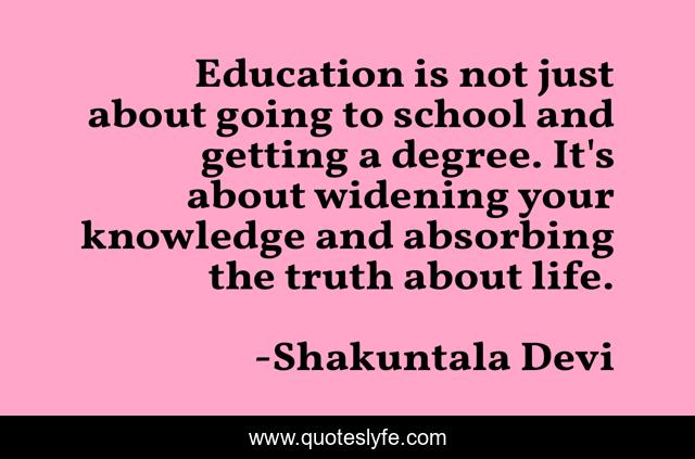 This page presents the quote "Education is not just about going to school and getting a degree. It's about widening your knowledge and absorbing the truth about life.". Author of this quote is Shakuntala Devi. This quote is about life, education, truth,.