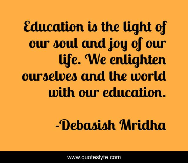 This page presents the quote "Education is the light of our soul and joy of our life. We enlighten ourselves and the world with our education.". Author of this quote is Debasish Mridha. This quote is about life, love, knowledge, inspirational, intelligence, philosophy, wisdom, quotes, affection,.