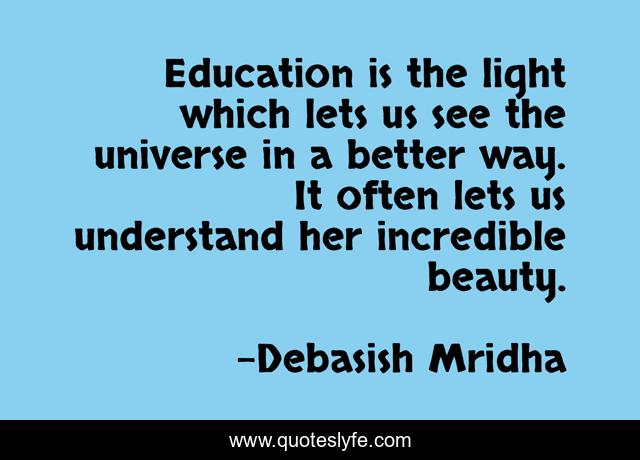 This page presents the quote "Education is the light which lets us see the universe in a better way. It often lets us understand her incredible beauty.". Author of this quote is Debasish Mridha. This quote is about beauty, universe, philosophy, debasish-mridha, inspirational, enthusiasm, education,.