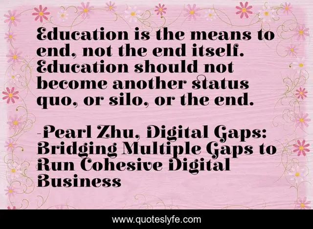 This page presents the quote "Education is the means to end, not the end itself. Education should not become another status quo, or silo, or the end.". Author of this quote is Pearl Zhu, Digital Gaps: Bridging Multiple Gaps to Run Cohesive Digital Business. This quote is about education, gap,.