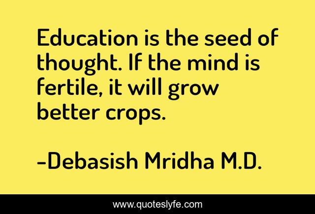 This page presents the quote "Education is the seed of thought. If the mind is fertile, it will grow better crops.". Author of this quote is Debasish Mridha M.D.. This quote is about debasish, mridha, philosophy, debasish-mridha, quotes, mind-is-fertile, seed-of-thought, inspirational, enthusiasm,.